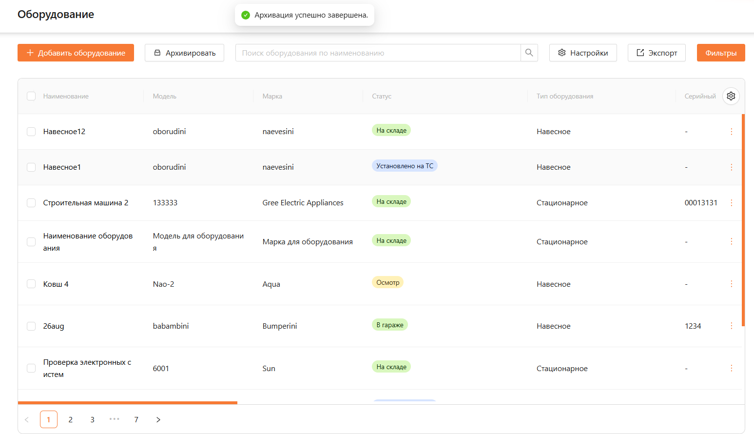 Архивировать: перемещения оборудования в архив, без необходимости удаления данных из системы.
