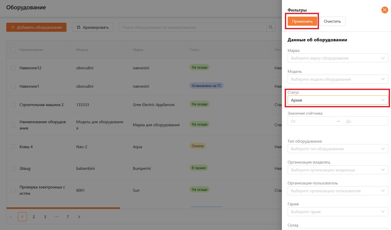 Для просмотра архивных оборудований необходимо в фильтрах выбрать статус “Архивный” и нажать на кнопку “Применить” (см. рисунок 20).
