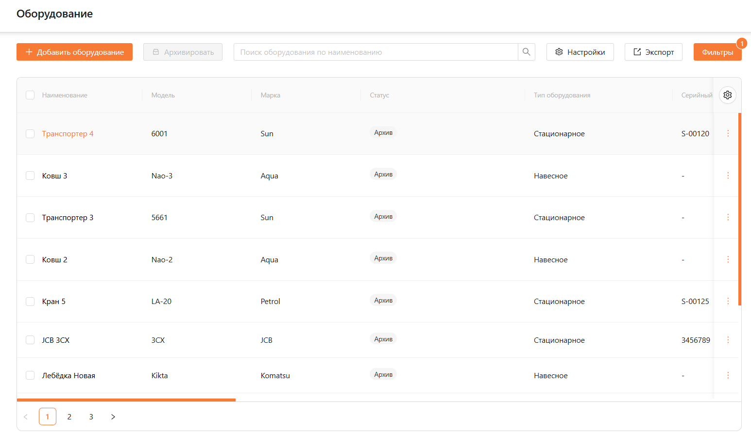 Фильтры: кнопка для применения фильтров к списку оборудования.