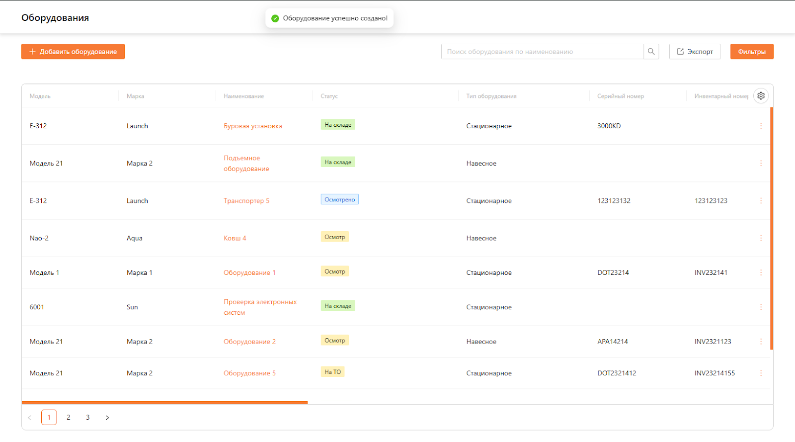 Добавить оборудование: кнопка для добавления нового оборудования.