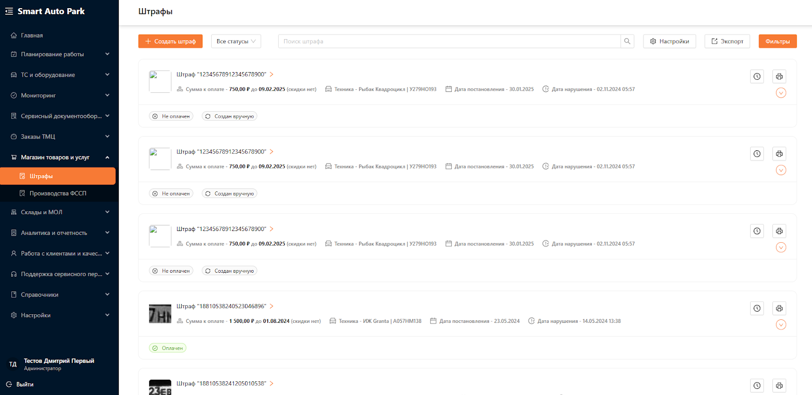 Для работы со штрафами выберите раздел “Магазин товаров и услуг” подраздел “Штрафы”. В этом подразделе отображаются все зарегистрированные административные штрафы, которые относятся к транспортным средствам, закреплённым за организацией. Система интегрирована с внешним сервисом OnlineГИБДД и автоматически выполняет синхронизацию данных, получая актуальную информацию о новых штрафах.