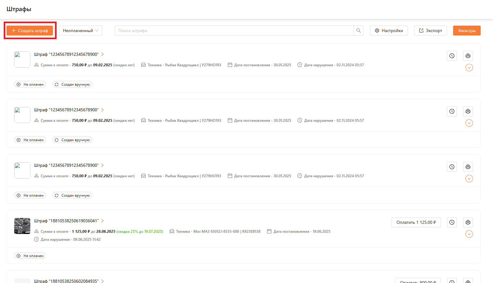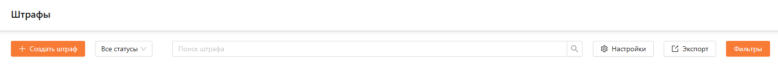 В выбранной подсистеме у пользователей с ролью “Администратор”, “Менеджер автопарка”, “Операционист” или “Диспетчер” есть доступ к кнопкам “Создать штраф”, “Настройки”, “Экспорт” и “Фильтры” (см. рисунок 3).