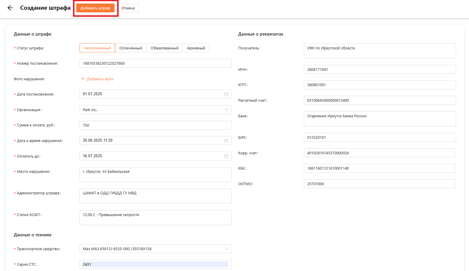 Заполняем обязательные поля в штрафе и нажимаем на кнопку “Добавить штраф” (см. рисунок 14).