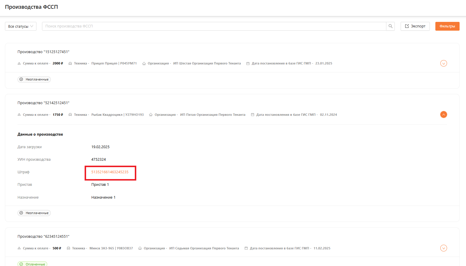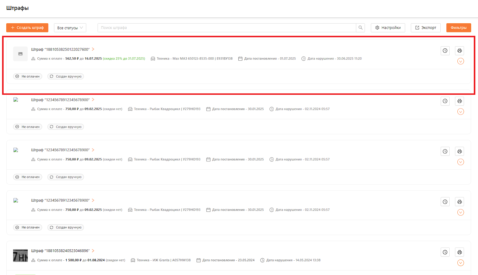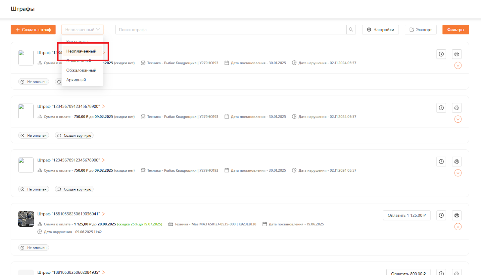 Для выбора штрафа можно отфильтровать их по статусу. В верхней панели доступен фильтр по статусу, например, "Неоплаченный". В результате в общем списке отобразятся все штрафы, полученные из OnlineГИБДД, а также те, что были созданы вручную.