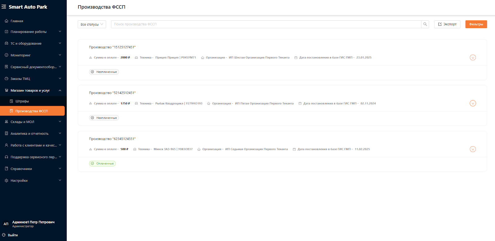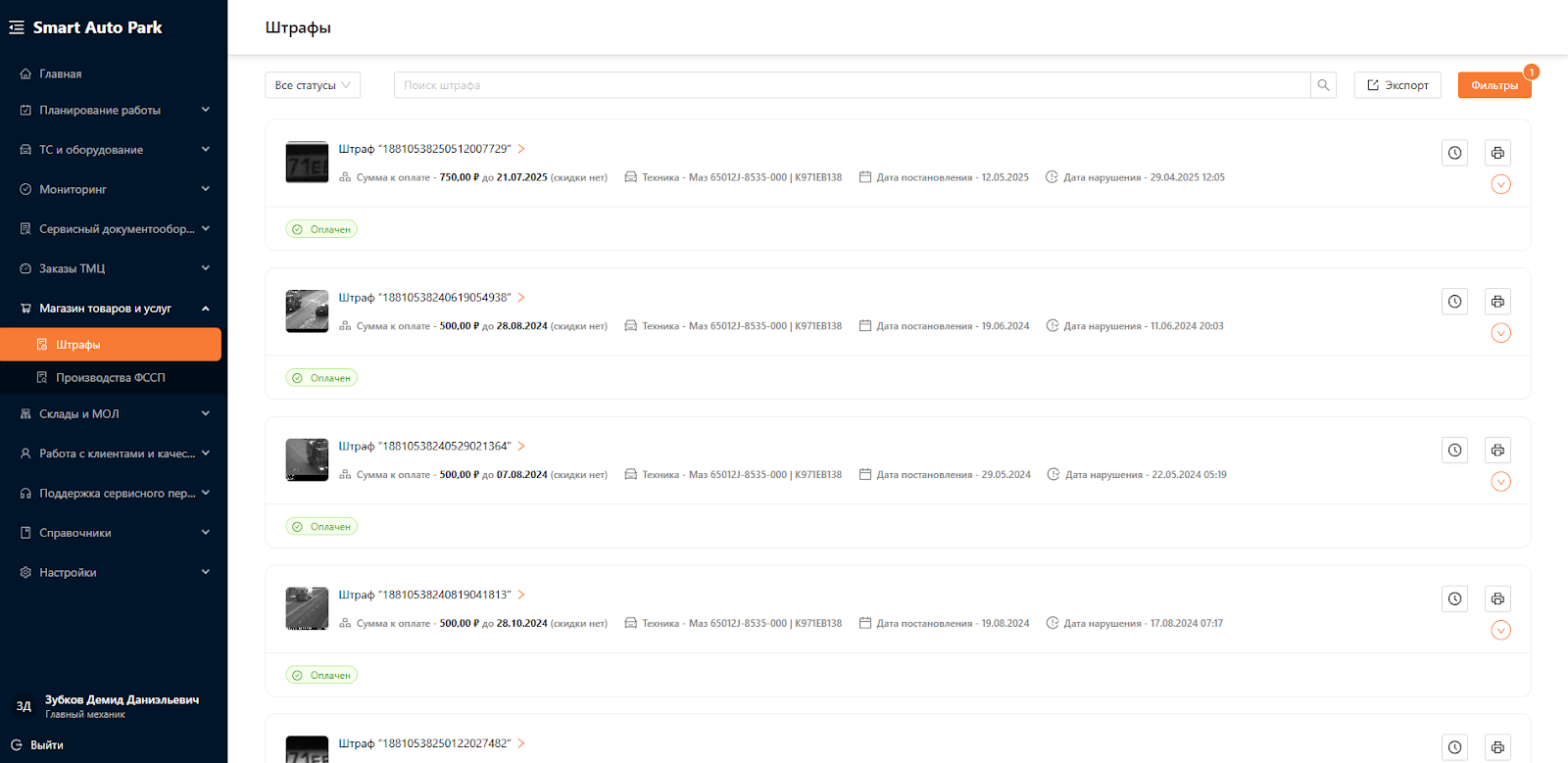 Система для управления автопарком предназначена для автоматизации и оптимизации всех аспектов эксплуатации и обслуживания транспортных средств и оборудования. Система является комплексным решением, охватывающим всю деятельность, связанную с управлением автопарка, от учета и мониторинга транспортных средств до планирования и аналитики. Одними из подразделов Системы являются “Штрафы” и “Производство ФССП”.