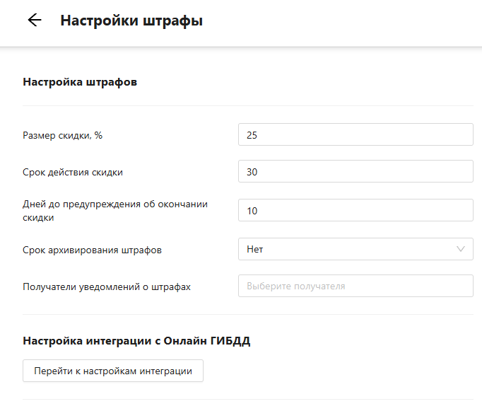 Настройки: кнопка для созданных вручную штрафов и переход к настройке интеграции (см. рисунок 5).