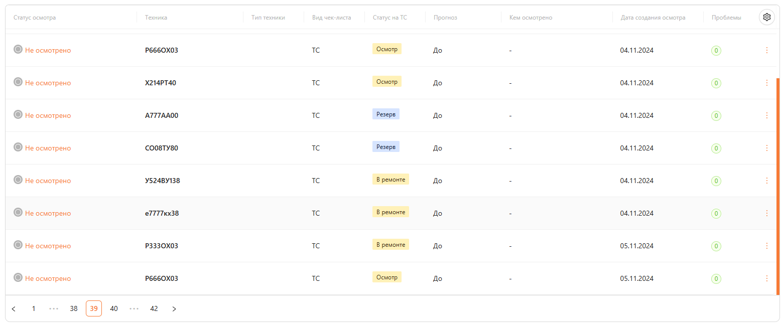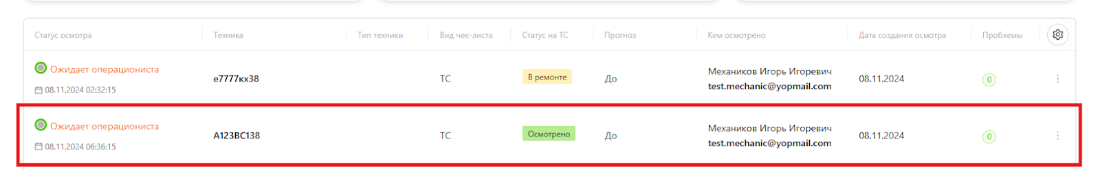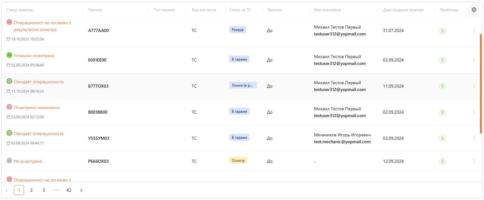С описанием статусов можно ознакомиться в таблице 2. Далее можно посмотреть на какое ТС был создан осмотр, статус самого ТС, дату и кем осмотрено, количество проблем.