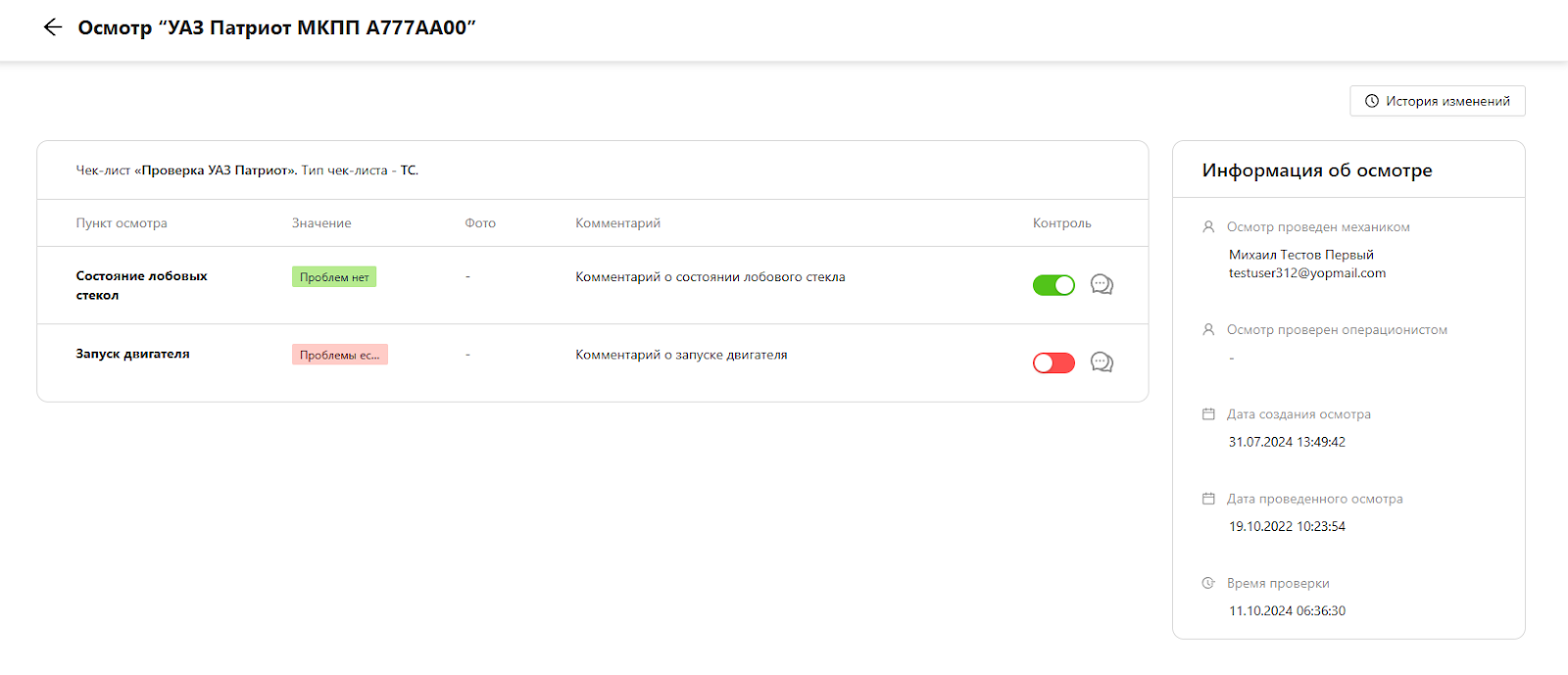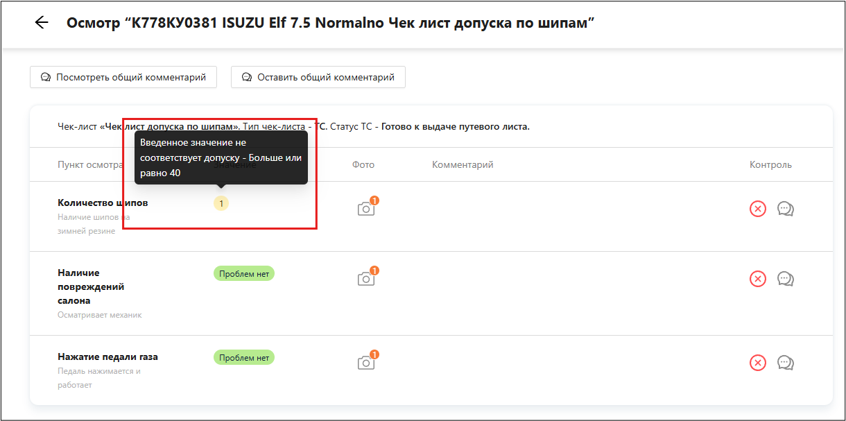 Пользователь с ролью “Администратор”, “Менеджер автопарка”, “Операционист” может провести контроль осмотра, оставить комментарий по каждому пункту.