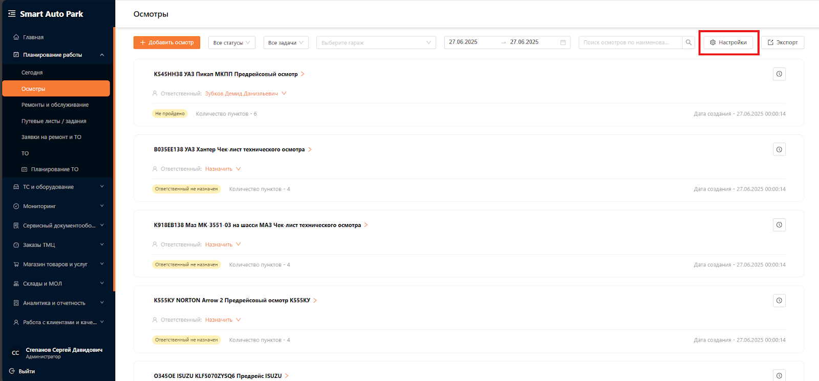 Для работы с осмотрами выберите раздел “Мониторинг” подраздел “Осмотры техники и оборудования”. На рисунке 1 представлен интерфейс, отображаемый для пользователей с ролями “Администратор”, “Менеджер автопарка”, “Операционист”. Для этих ролей в подразделе доступны дополнительные параметры, которые можно настроить с помощью кнопки “Настройки”.