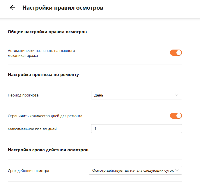 Можно настроить автоматическое назначение главного механика на осмотр. Если эта функция отключена, назначение пользователя выполняется вручную. Также доступна настройка максимально допустимого периода прогноза ремонта, который может указать механик при выявлении неисправности, требующей ремонта. Дополнительно можно задать срок действия осмотра (см. рисунок 15).