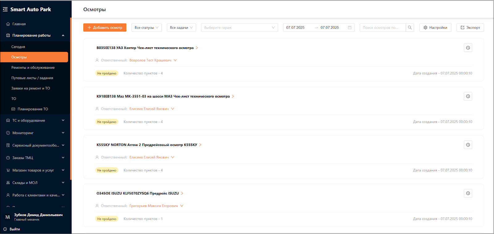 После назначения ответственного механика только он может провести осмотр ТС, оборудования или гаража, пройдясь по чек-листу, созданному ранее (см. рисунок 18).