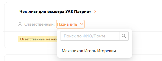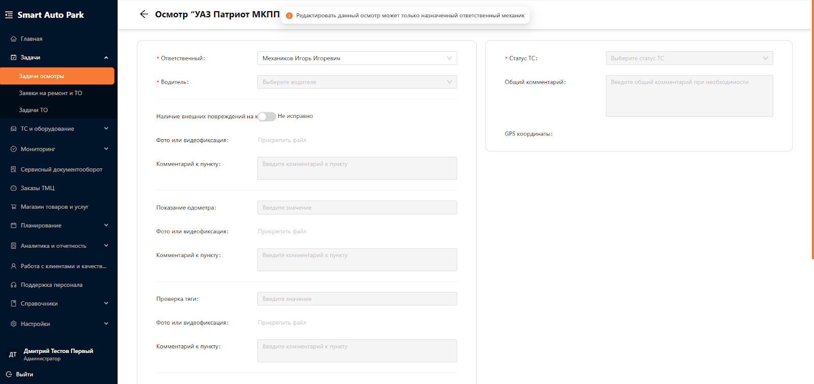 Сюда попадают задачи на проведение ежедневного осмотра ТС, оборудования или гаража. Пользователь с ролью “Главный механик” может указать ответственного пользователя с ролью “Механик” за проведение осмотра (см. рисунок 17).