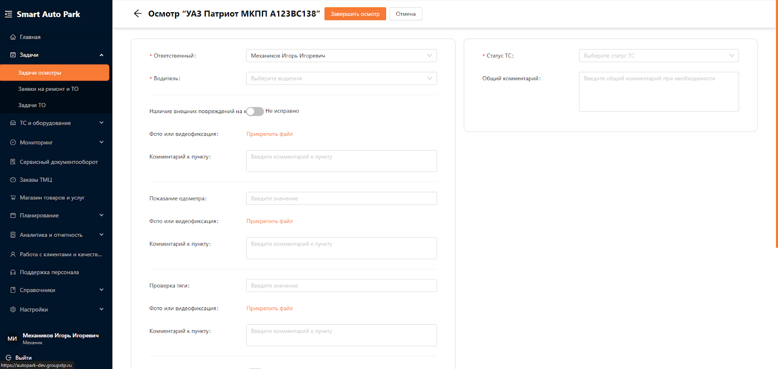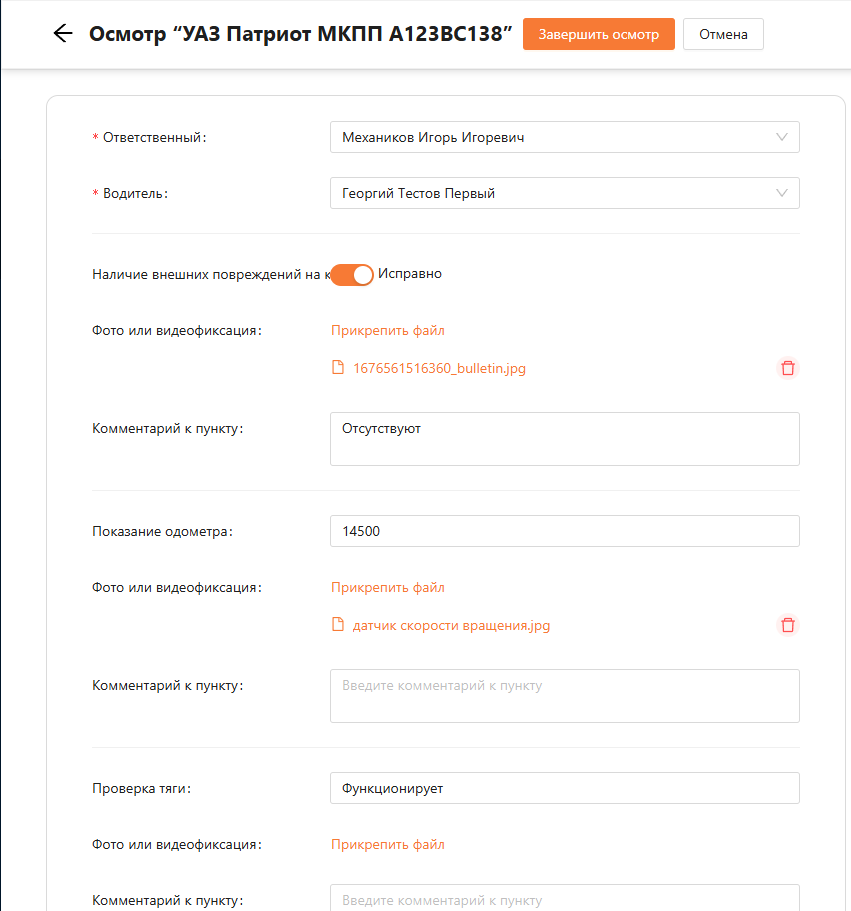 Механик указывает водителя, результат осмотра (выполнен/не выполнен, строковые или числовые значения), прикрепляет фото и оставляет комментарий при необходимости (см. рисунок 20).