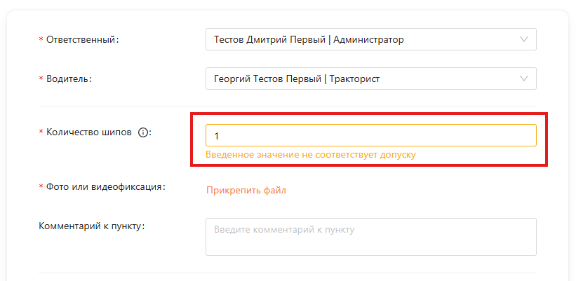 Если в чек-листе предусмотрены пункты с допусками, пользователю необходимо учитывать допустимые значения, заданные заранее в справочнике допусков. Если в процессе осмотра будет введено значение, не соответствующее этому диапазону, система отобразит предупреждение, а сама строка будет дополнительно выделена, сигнализируя о нарушении допуска (см. рисунок 21).
