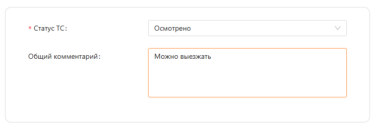 Далее указывается статус ТС/оборудования/гаража (см. рисунок 22). При этом можно оставить общий комментарий по осмотру в целом (в дальнейшем планируется вместо него чат) и указываются GPS-координаты, где проводился осмотр.