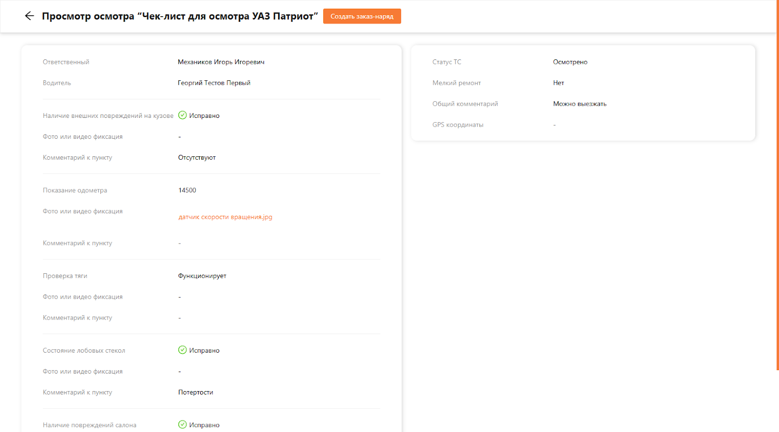 GPS-координаты получаем в автоматическом режиме с устройства, с которого осуществлен вход в систему. Механики этот атрибут не видят. Пользователи с ролью “Администратор”, “Менеджер автопарка”, “Операционист”, “Главный механик” могут видеть GPS-координаты осмотра. Пройденный осмотр представлен на рисунке 23.