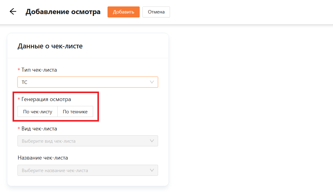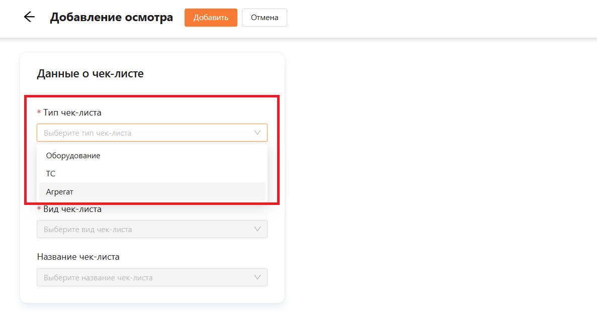 Если для выбранной техники уже существует чек-лист, поле «Название чек-листа» заполнится автоматически. В противном случае необходимо предварительно создать чек-лист для данной техники. После этого нажмите кнопку “Добавить” (см. рисунок 33).