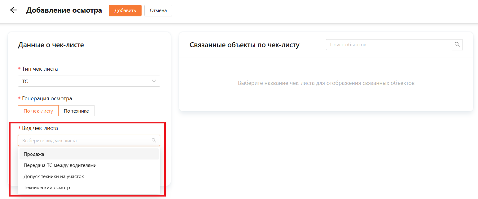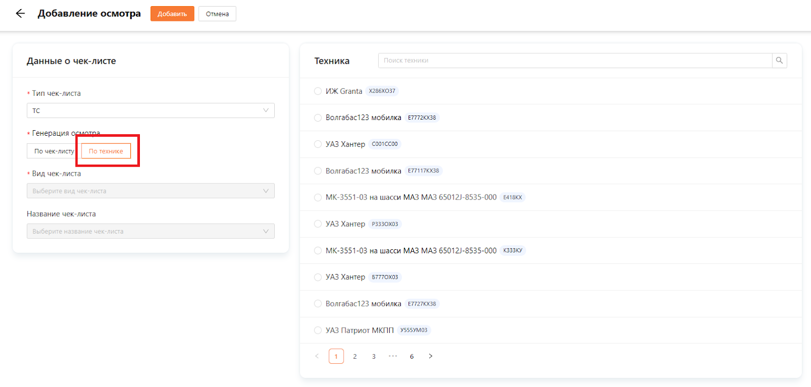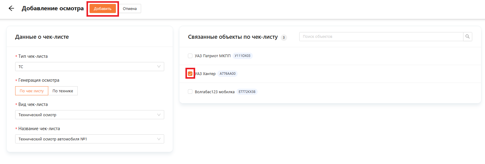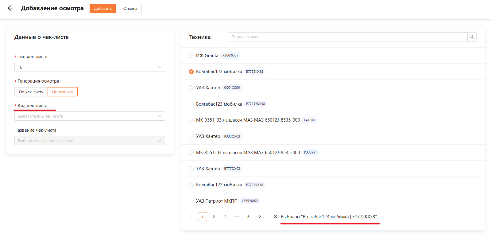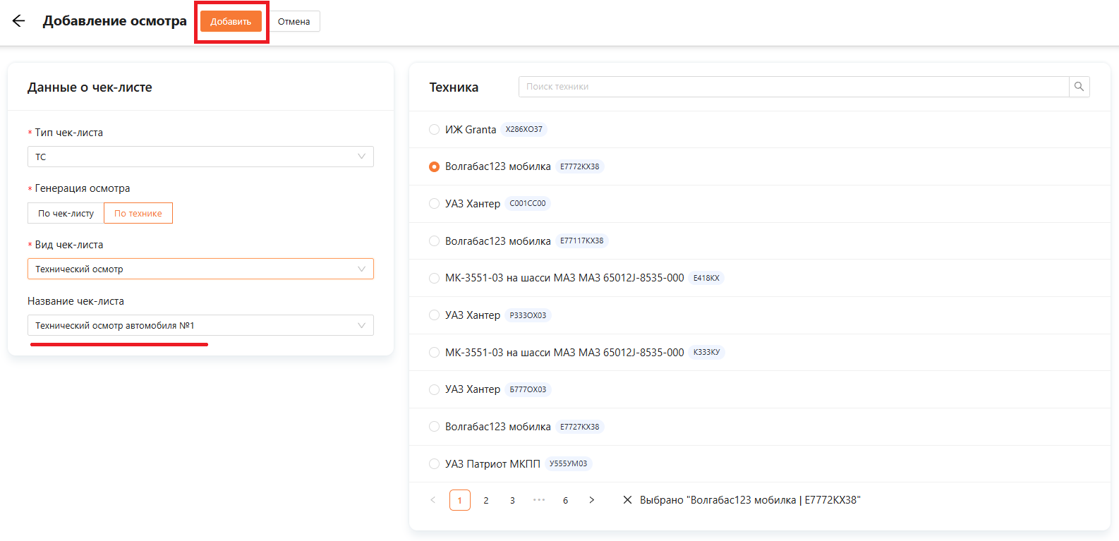 Выбираем вид чек-листа — “Технический осмотр”, затем указываем наименование чек-листа. В правой части интерфейса отобразится список транспортных средств, соответствующих выбранному чек-листу. Выбираем одно или несколько транспортных средств, после чего нажимаем кнопку “Добавить”(см. рисунок 29).