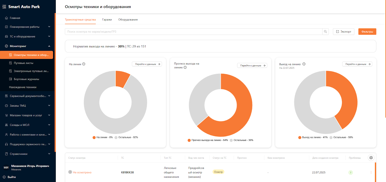 Система для управления автопарком предназначена для автоматизации и оптимизации всех аспектов эксплуатации и обслуживания транспортных средств и оборудования. Система является комплексным решением, охватывающим всю деятельность, связанную с управлением автопарка, от учета и мониторинга транспортных средств до планирования и аналитики. Одним из подразделов Системы является “Осмотры”.