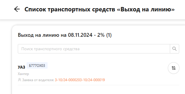 При нажатии на кнопку “Перейти к данным” на первом графике “На линии” будет выведен список ТС, находящихся на линии. Если рядом с ТС будет гореть иконка с человечком (см. рисунок 6), это значит, что на ТС была сформирована заявка от водителя, при клике на номер заявки можно перейти на страницу созданной заявки.