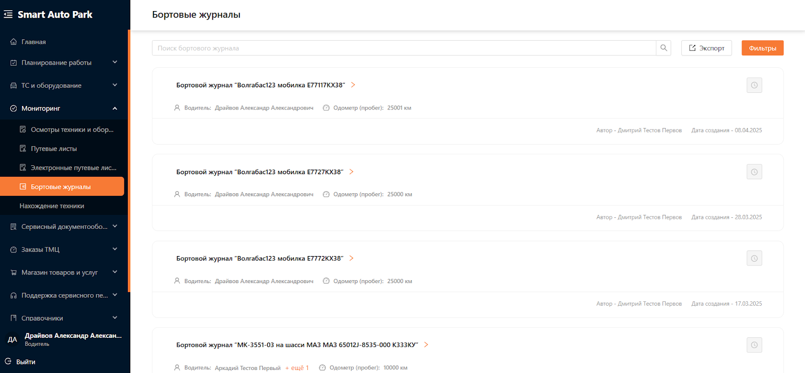 На рисунке 1 представлен интерфейс, который видят пользователи с ролью “Администратор”, “Менеджер автопарка”, “Операционист”, “Механик”, “Главный механик”, “Водитель”, “Машинист”. Для пользователей с ролью “Водитель” отображаются только те бортовые журналы, которые закреплены за ними.