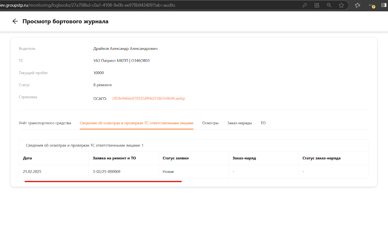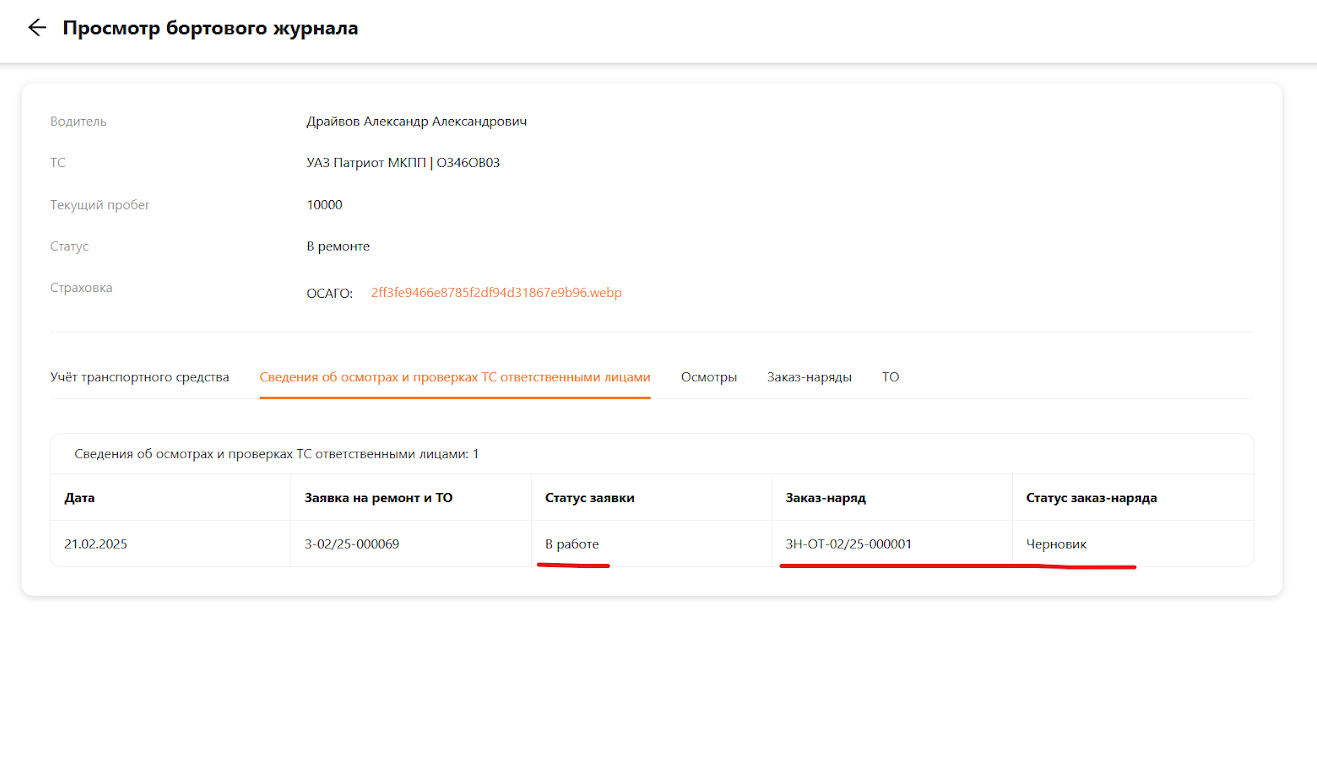 После проверки заявки механиком её статус будет обновлён. На основании данной заявки механик может открыть заказ-наряд (подробнее см. [руководство по заказ-наряду]). Номер заказ-наряда и его статус отобразятся в данном разделе (см. рисунок 11).