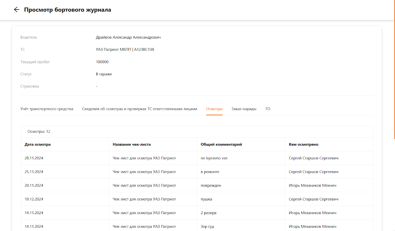 Далее перейдем в следующую вкладку. В бортовых журналах “Осмотры” отображается краткая информация об осмотрах транспортного средства, включая дату осмотра, название чек-листа, общий комментарий и ФИО сотрудника, проводившего осмотр. Для просмотра откройте вкладку “Осмотры” (см. рисунок 12).