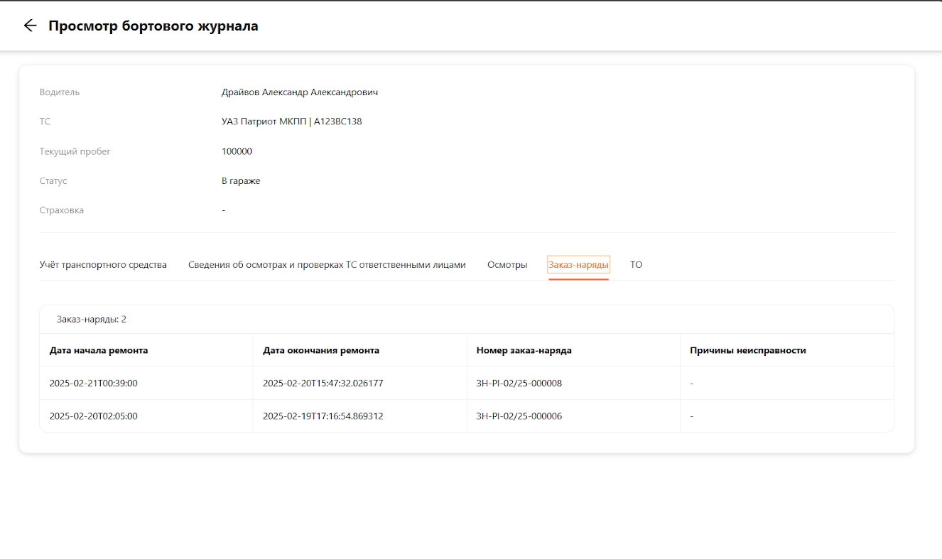 Перейдите во вкладку “заказ-наряды”. В этом разделе отображается краткая информация по заказ-нарядам транспортного средства (см. рисунок 13).