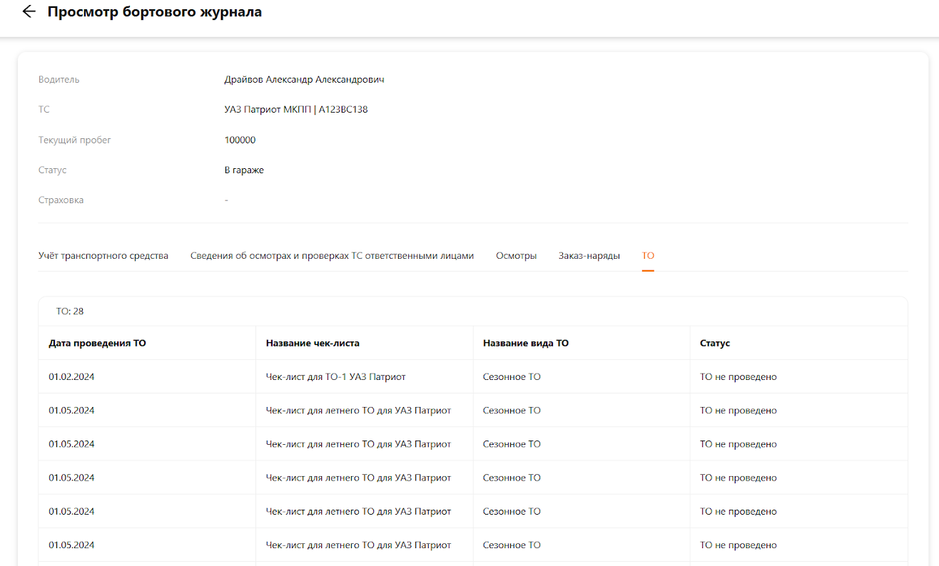 Последний вкладка в бортовом журнале — “ТО”. В данном разделе отображается список основных сведений техническом обслуживании. Для просмотра откройте вкладку “ТО” в бортовом журнале (см. рисунок 14).