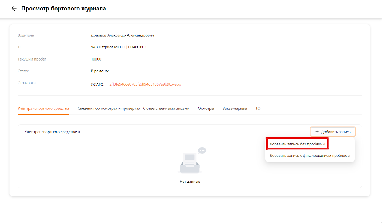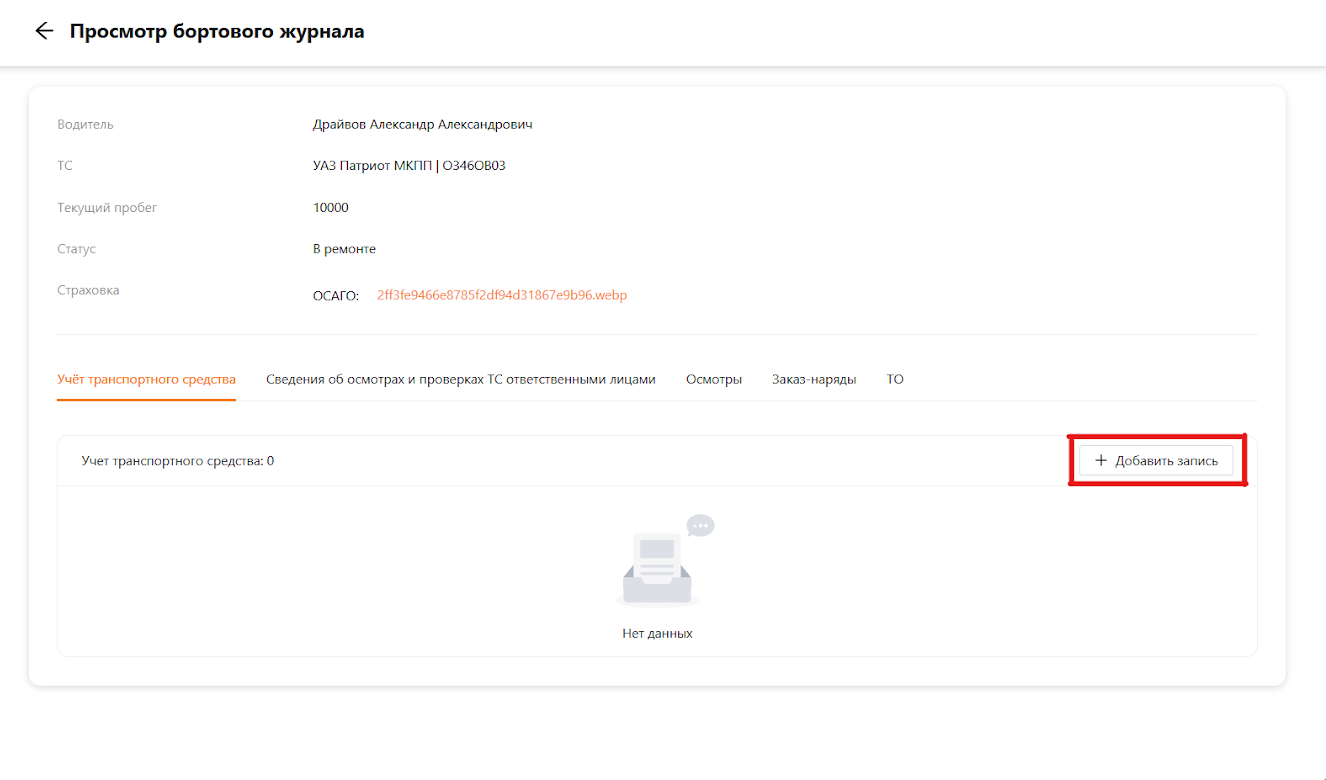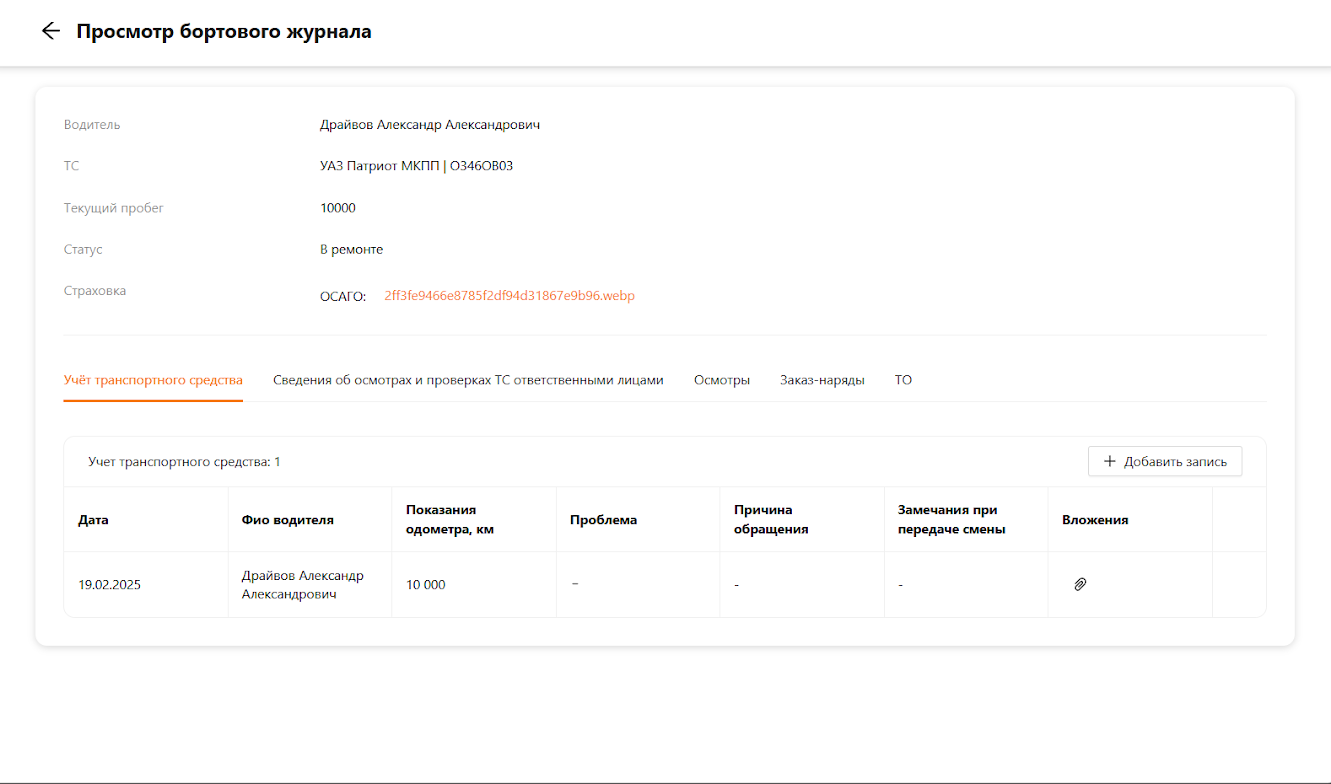 При открытии бортового журнала пользователь может ознакомится с основная информацией по транспортному средству: кто закреплен за ТС, марка и модель, текущий пробег, статус и информация о страховках. Для заполнения бортового журнала зайдем с ролью “Водитель” и создадим запись (см. рисунок 3).