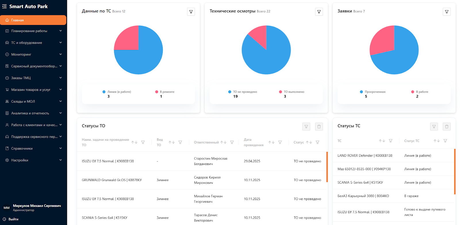 Главная страница предназначенна для оперативного отображения основных показателей и текущих задач пользователя. На ней с помощью виджетов отображаются статусы заявок на ремонт, технического обслуживания, заказ-нарядов, осмотров, путевых листов, штрафов, а также визуализируются аналитические диаграммы по количеству и просроченным задачам (статистика по автопарку).