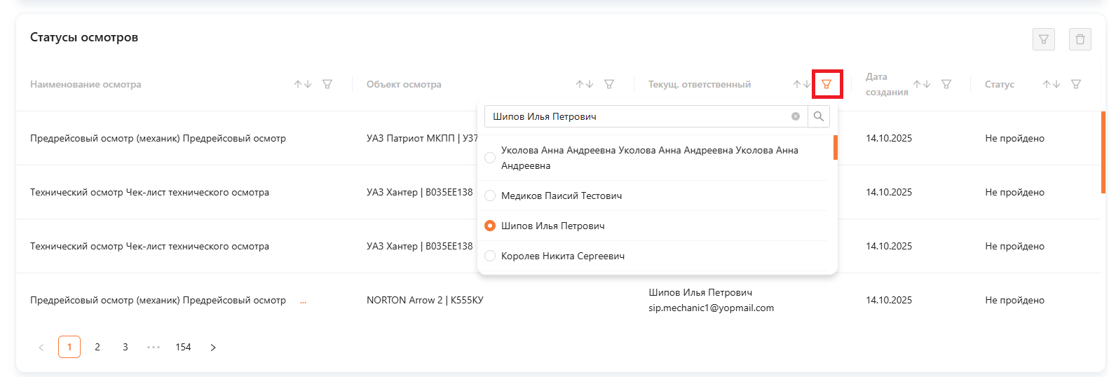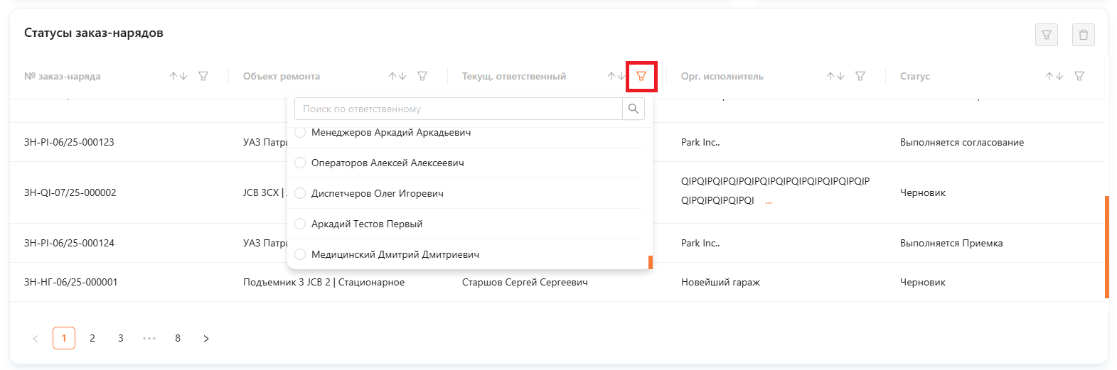 Для каждого столбца предусмотрен фильтр, который находится справа от заголовка столбца. Например, в фильтре столбца “Текущий ответственный” можно выбрать конкретного исполнителя для быстрого поиска в таблице (см. рисунок 19).