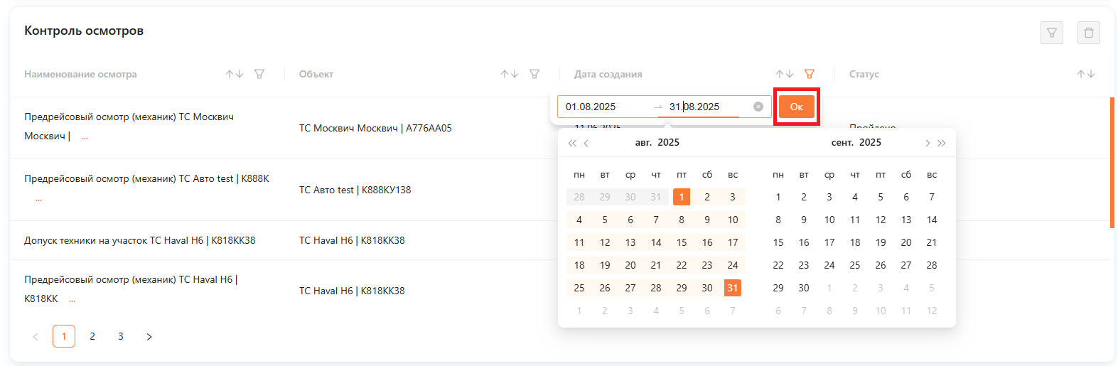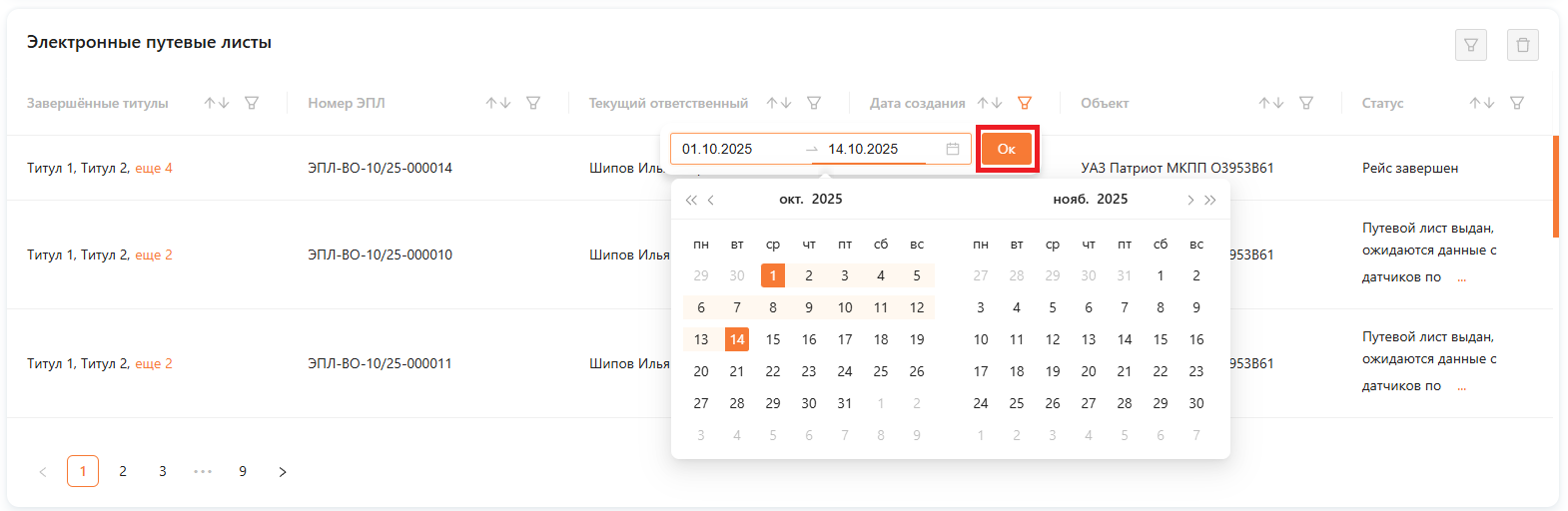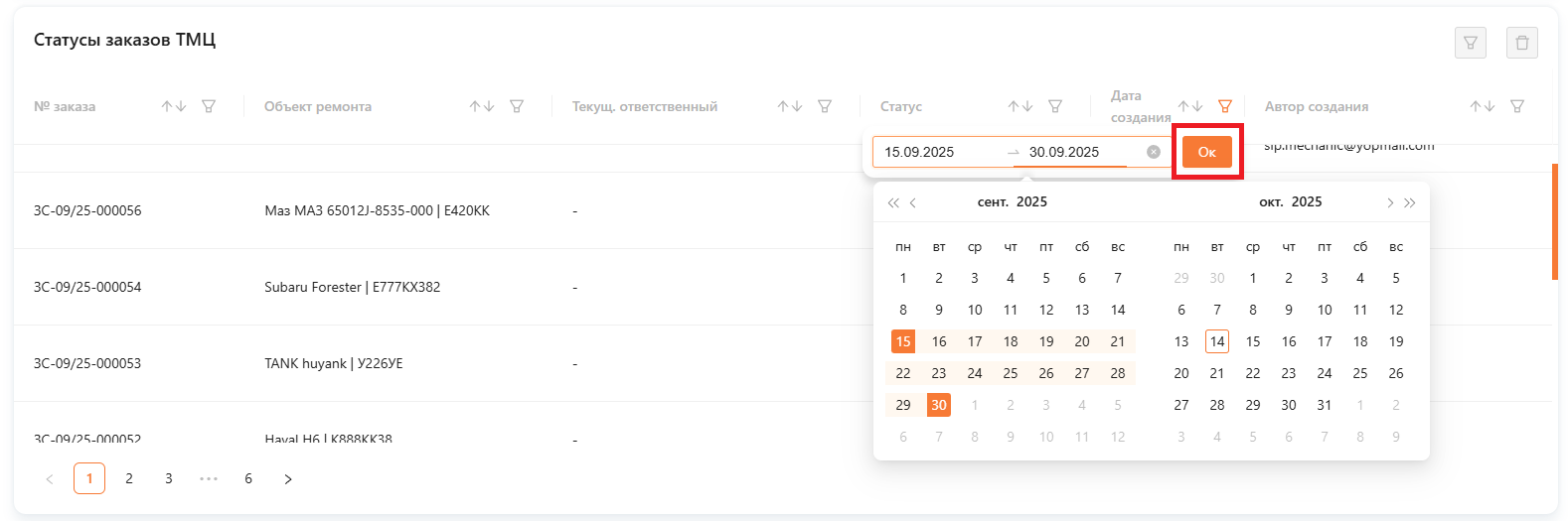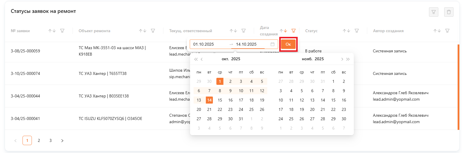Для каждого столбца предусмотрен фильтр, который находится справа от заголовка столбца. Например, в столбце “Дата создания” можно выбрать конкретный промежуток времени и нажать на кнопку “Ок” (см. рисунок 17).