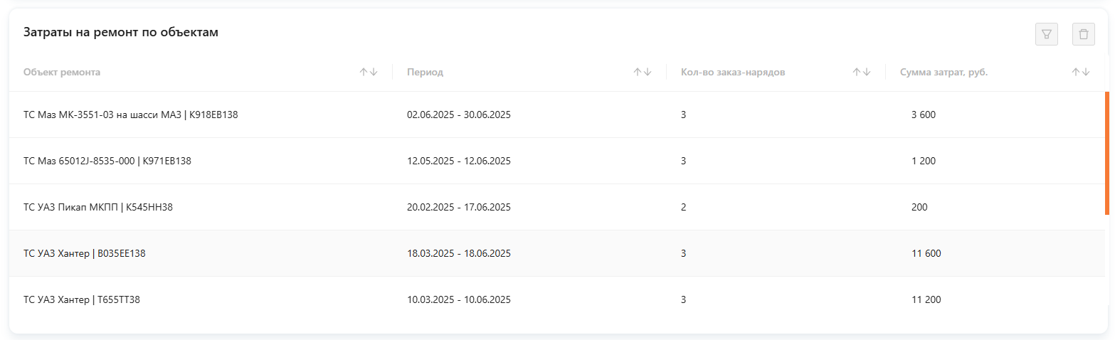 Виджет “Затраты на ремонт по объектам” отображает затраты на ремонт по объектам за выбранный период (ТС, оборудование и т.д.).