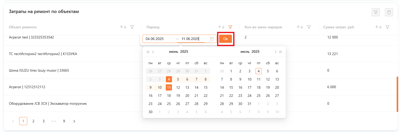 ДДля каждого столбца предусмотрен фильтр, который находится справа от заголовка столбца. Например, в столбце “Период” можно выбрать конкретный промежуток времени и нажать на кнопку “Ок” (см. рисунок 15).