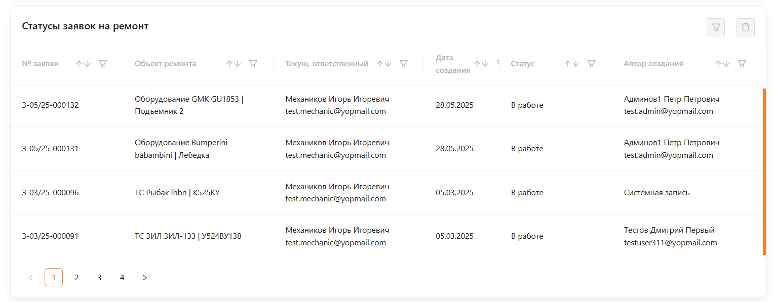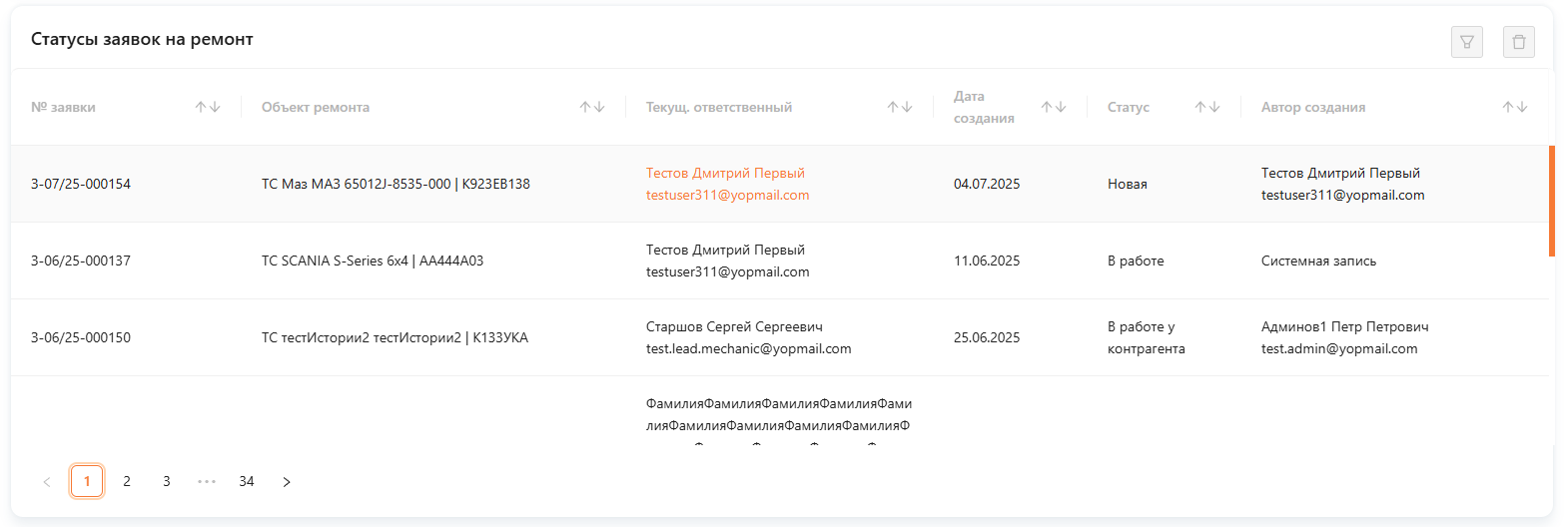 Виджет “Статусы заявок на ремонт” отображает список новых, просроченных, в работе, в работе у контрагента и отклоненных заявок (см. рисунок 33). Как и на главной странице доступна фильтрация по столбцам.