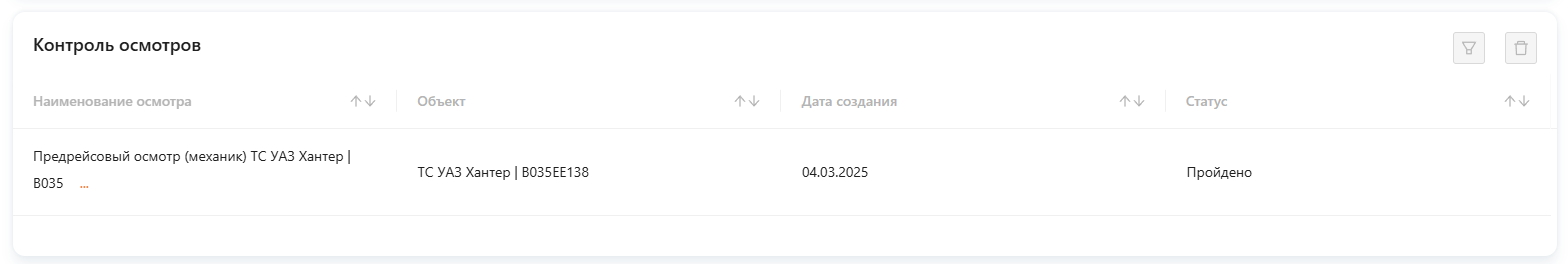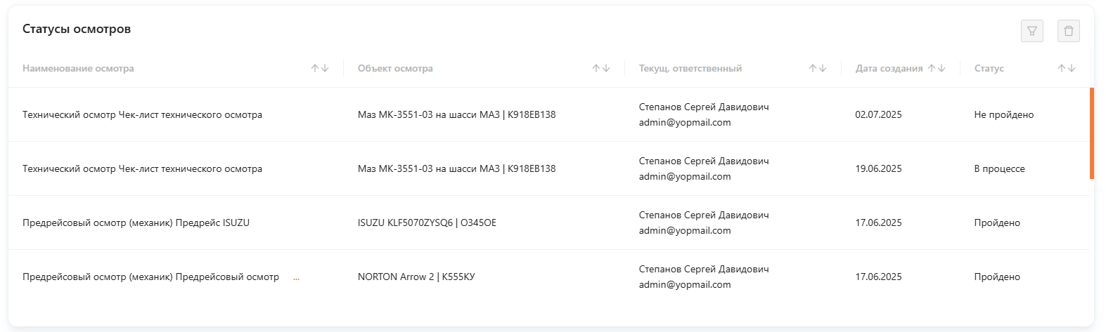 Виджет “Статусы осмотров” отображает список задач на осмотры на текущий день со статусами осмотров (см. рисунок 34). Как и на главной странице доступна фильтрация по столбцам.