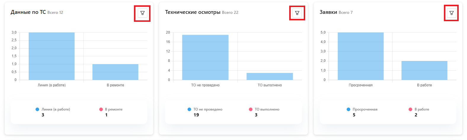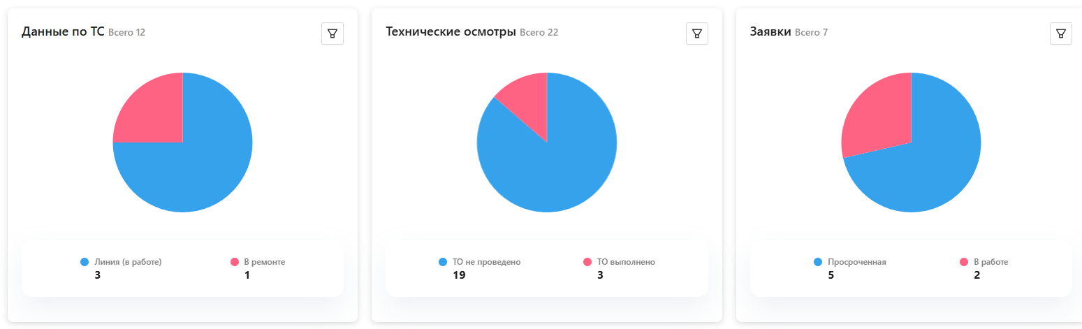 Виджет “Статистика по автопарку” отображает актуальную информацию на текущий день: общее количество транспортных средств, число ТС на линии, в ремонте, в резерве, а также количество просроченных заявок и технических обслуживаний. Данные представлены в виде круговой или столбчатой диаграммы. (см. рисунок 2).