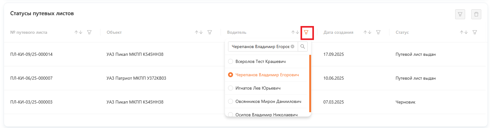 Для каждого столбца предусмотрен фильтр, который находится справа от заголовка столбца. Например, в фильтре столбца “Водитель” можно выбрать конкретного водителя для быстрого поиска в таблице (см. рисунок 21).