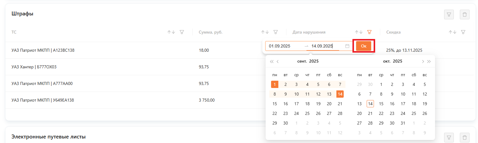 Для каждого столбца предусмотрен фильтр, который находится справа от заголовка столбца. Например, в столбце “Дата нарушения” можно выбрать конкретный промежуток времени и нажать на кнопку “Ок” (см. рисунок 25).
