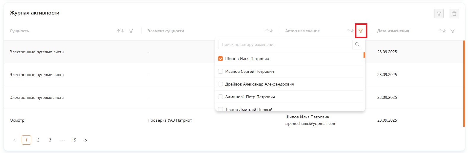 Для каждого столбца предусмотрен фильтр, который находится справа от заголовка столбца. Например, в фильтре столбца “Автор изменения” можно выбрать конкретного пользователя для быстрого поиска в таблице (см. рисунок 29).