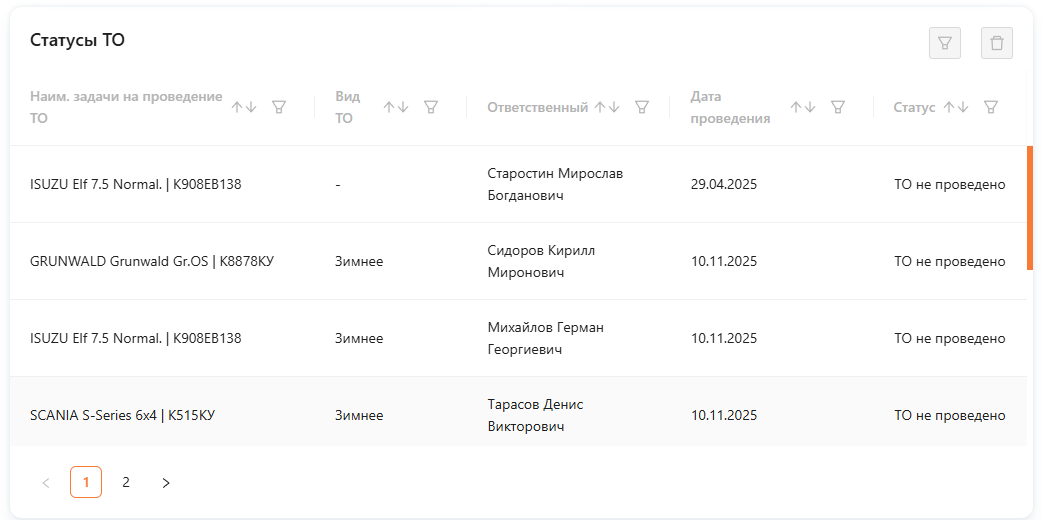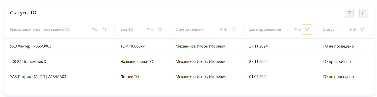 Виджет “Статусы ТО” отображает текущие задачи на проведение технического обслуживания, исключая выполненные и архивные статусы (см. рисунок 31). Как и на главной странице доступна фильтрация по столбцам.