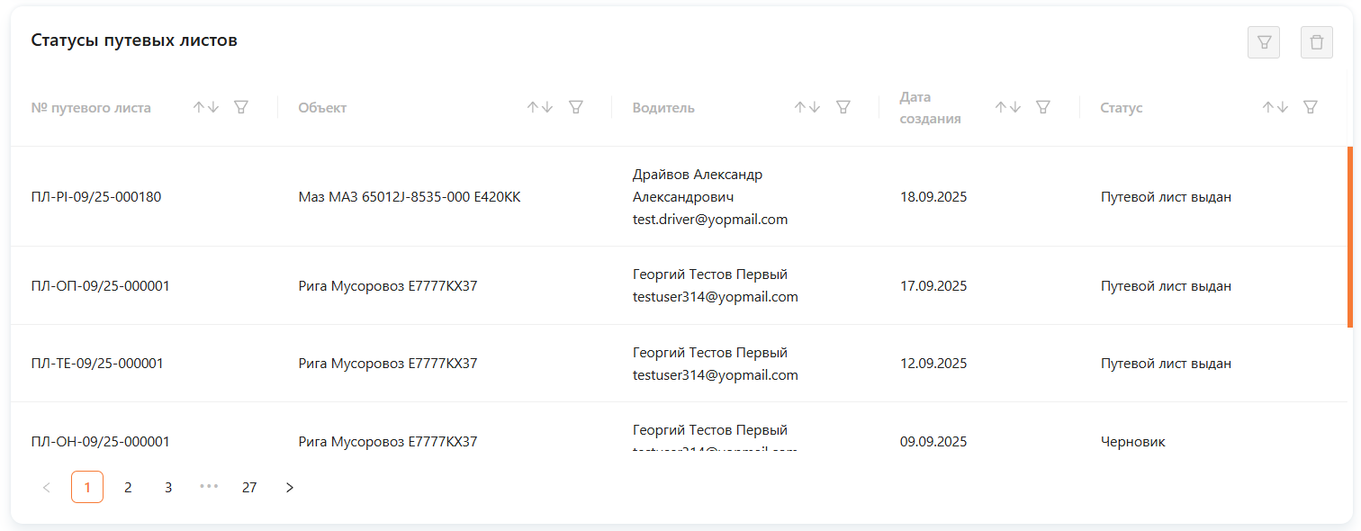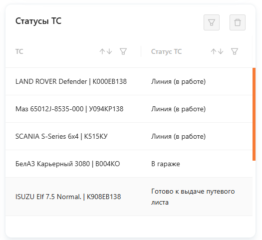 Виджет "Статусы путевых листов" отображает статусы всех текущих путевых листов, за исключением завершённых и архивных (см. рисунок 35). Как и на главной странице доступна фильтрация по столбцам.