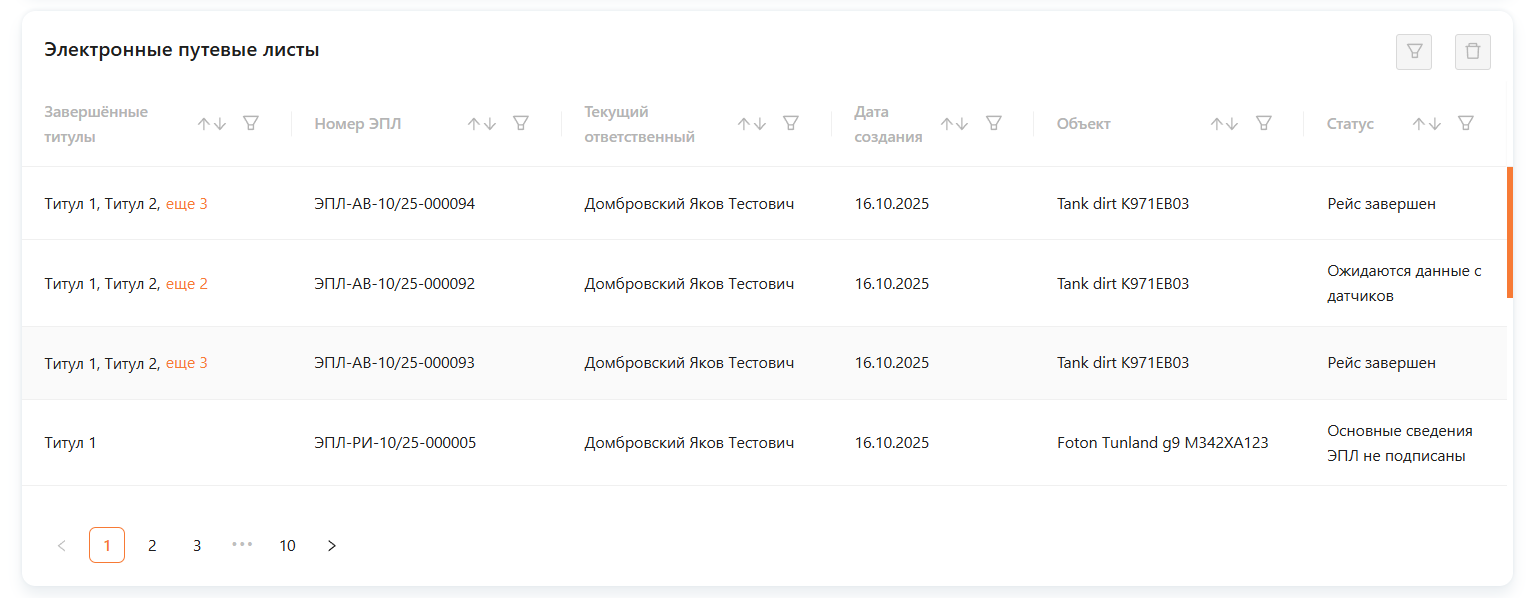 Виджет "ЭПЛ" отображает список задач (титулов), сформированных для выдачи электронных путевых листов (ЭПЛ). Он позволяет контролировать статус выполнения этих задач (см. рисунок 36). Как и на главной странице доступна фильтрация по столбцам.