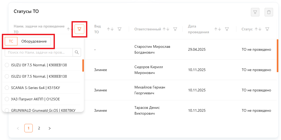 Для каждого столбца предусмотрен фильтр. В фильтре столбца “Наименование задачи на проведение ТО” можно выбрать конкретное транспортное средство или оборудование (см. рисунок 5).