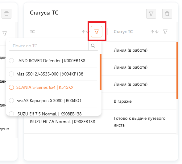 Для каждого столбца предусмотрен фильтр, который находится справа от заголовка столбца. С помощью фильтра в столбце "ТС" можно выбрать конкретное транспортное средство для быстрого поиска (см. рисунок 8).