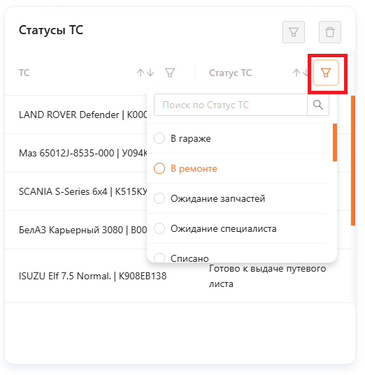 В фильтре столбца "Статус ТС" можно отфильтровать транспортные средства по их статусу (см. рисунок 9).