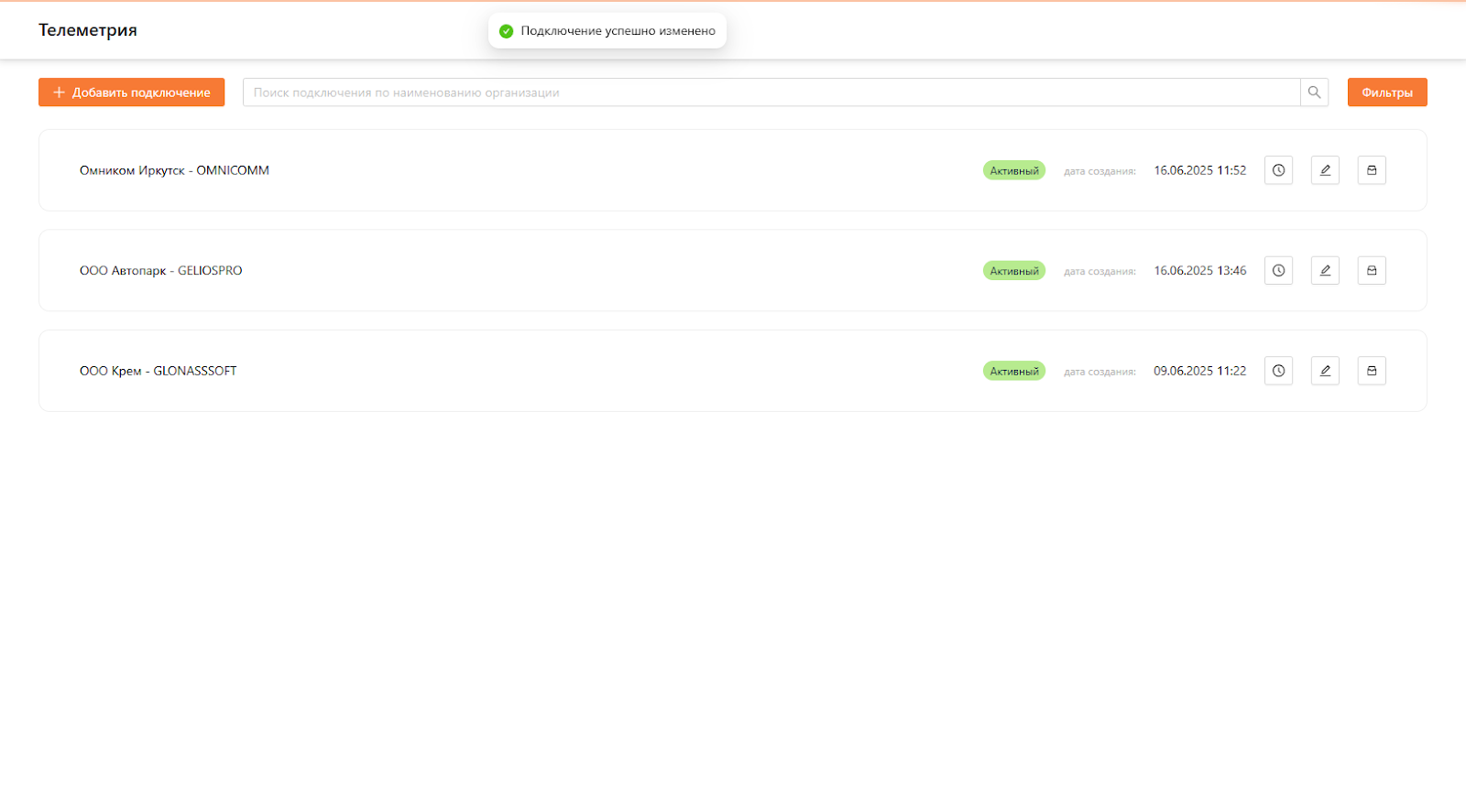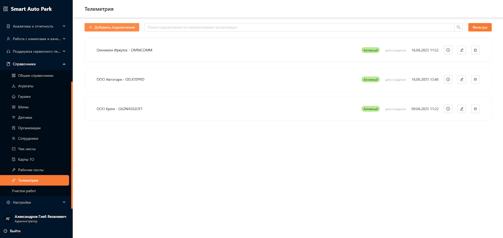 В выбранной подсистеме у пользователей с ролью “Администратор”, “Менеджер автопарка”, “Операционист” есть доступ к кнопкам “Добавить подключение”, “Экспорт” и “Фильтры” (см. рисунок 2). Для остальных пользовательских ролей данные опции заблокированы.