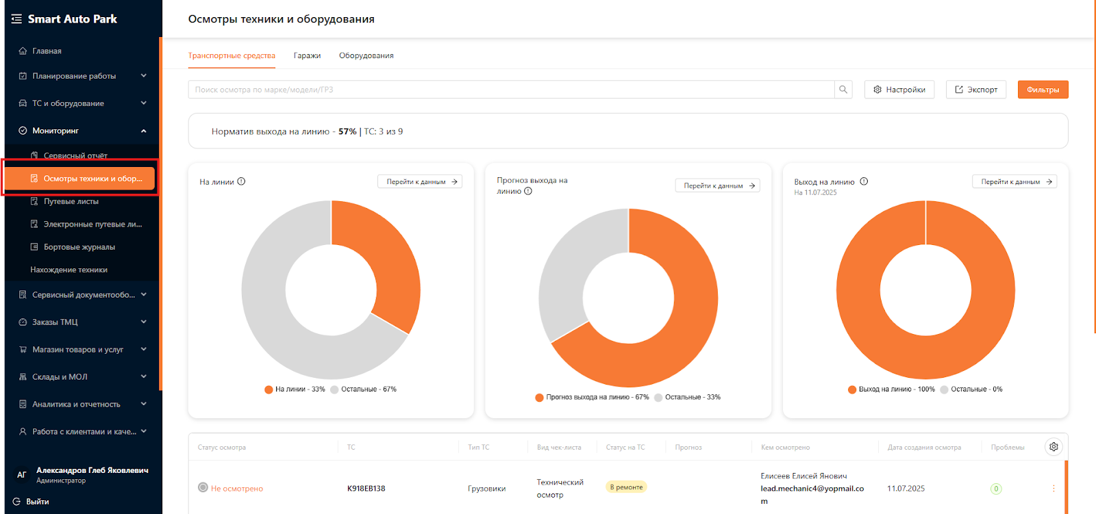 Для отслеживания ТС, которые находятся на линии, перейдите в раздел “Мониторинг”, подраздел “Осмотры техники и оборудования” (см. рисунок 10).