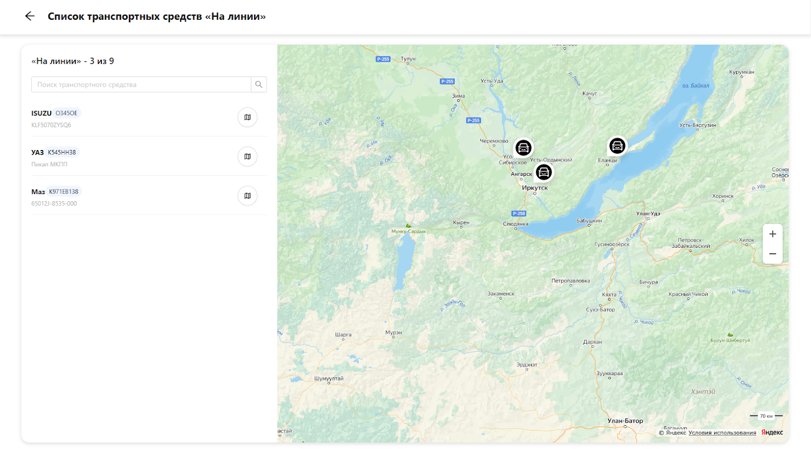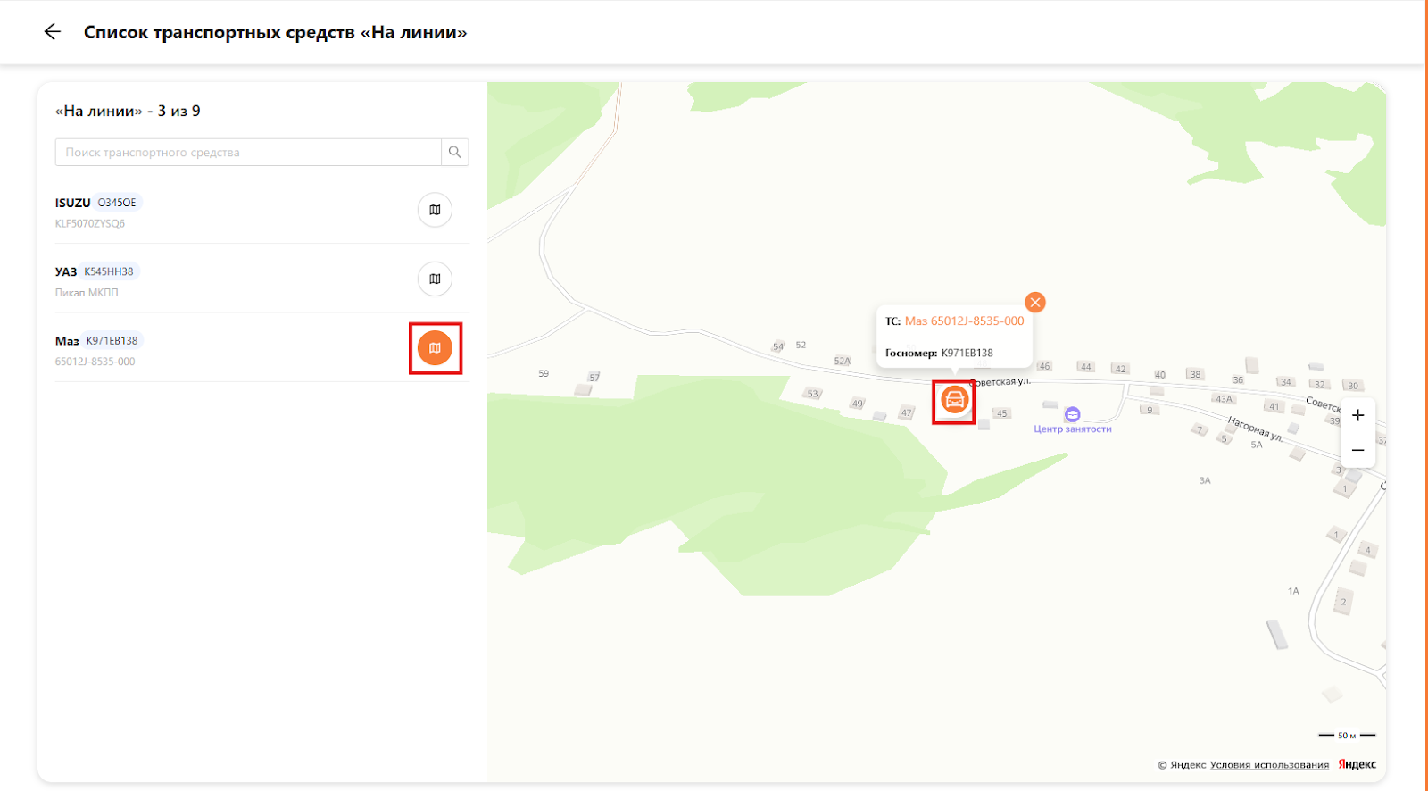 В открывшемся окне слева представлен список ТС, которые находятся на линии, справа – карта, которая отображает местоположение этих ТС (см. рисунок 12).